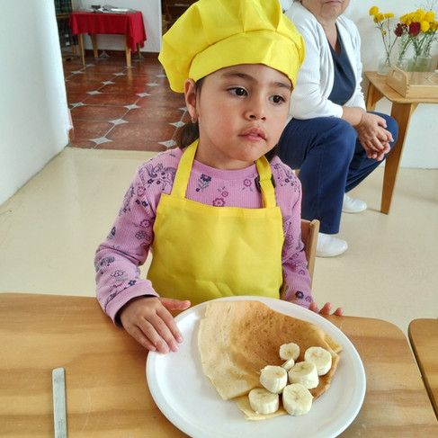 Entonces llegaron las crepas — recién preparadas y listas para decorar. Cada learner eligió sus toppings: crema batida, Oreos, Nutella. Las prepararon con cuidado y las disfrutaron aún más.