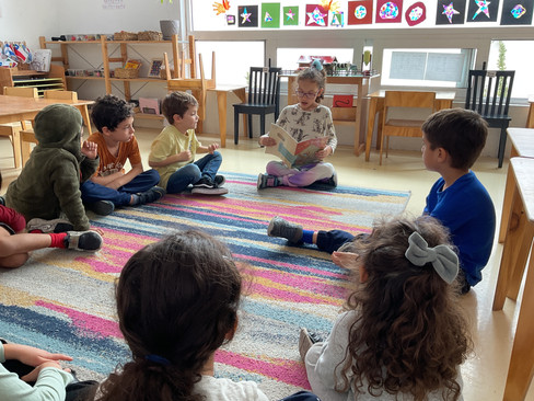 Leonor se ofreció durante el DEAR Time a leer una historia a sus amigos, La caja de juguetes. Escucharon con atención y observaron las imágenes, trabajaron durante Quest creando unas lupas que les permitirían salir a observar con atención su alrededor para descubrir las figuras geométricas a su alrededor.