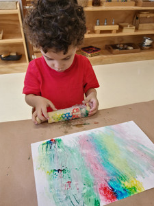 En el área de arte la propuesta de esta semana fue explorar con pintura y rodillos envueltos en papel burbuja. Al sentir la textura, comenzaron a tronar las burbujas con sus dedos, después sobre el papel blanco se puso la pintura y ellos iniciaron a desplazar los rodillos y observar cómo la pintura se marcaba diferente en el papel y cómo se mezclaban los colores. Las actividades con pintura siempre son una fuente de estimulación sensorial para los niños: utilizan los sentidos vista y tacto, al manipular el rodillo desarrollan su psicomotricidad fina además fomenta su concentración y la relajación.