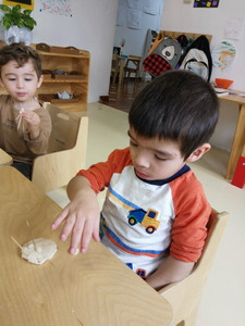 Preparamos masa de plastilina con la ayuda de uno de los niños, siguiendo una receta sencilla utilizando sal, harina, agua y colorante. En esta ocasión se dejó la masa en color natural. Se les dio una pelota de plastilina y 10 palillos a cada quien, así aprovechamos para seguir practicando el conteo del 1-10. Trabajaron creando diferentes objetos: avión, muñequitos, un sol… desarrollando su creatividad.